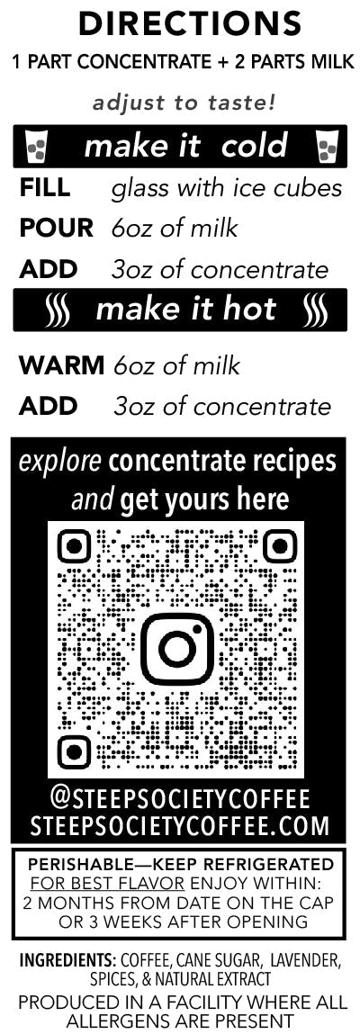 Made fresh to order. Best enjoyed within 2 months of bottling or 3 weeks of opening. Each serving contains 150 mg of caffeine and is slightly sweet.